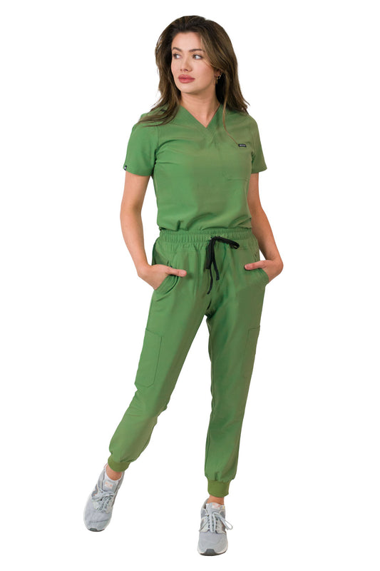 Medgear Aurora Women's Scrubs Set, V-Neck One Pocket Top with Knit Rib Cuffs Jogger Pants